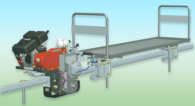 最大200kg牽引可能な牽引車と荷物台車のセットです。レール設置角度は45度までです。人は乗れません。乗車用には乗用台車をセットしたタイプをお求めください。