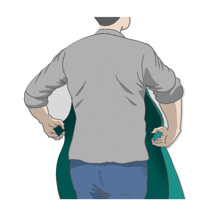 腰の縫込みスプリングを広げて、腰に当てるだけのワンタッチ装着!紐結びもボタン留めもいらないから、誰でもすばやく簡単に装着できます。
